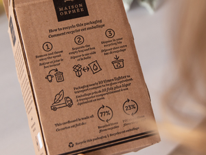 1) Une boite de carton faite à partir de 77% de fibres recyclées et de 23% de fibres vierges FSC (Forest Stewardship Council) ;